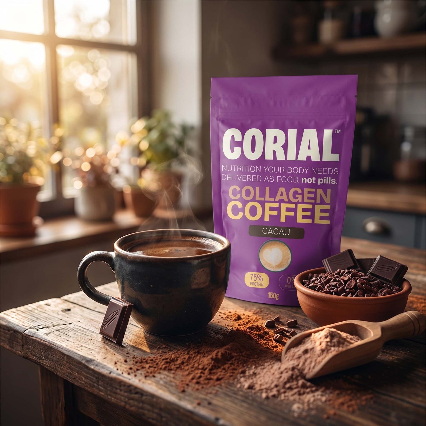 It's a soluble preparation that combines hydrolyzed collagen with coffee. Simply add hot water or milk for a functional high-protein coffee. Available in two flavors: Original (85% collagen, 2 ingredients) and Cocoa (75% collagen, 3 ingredients).