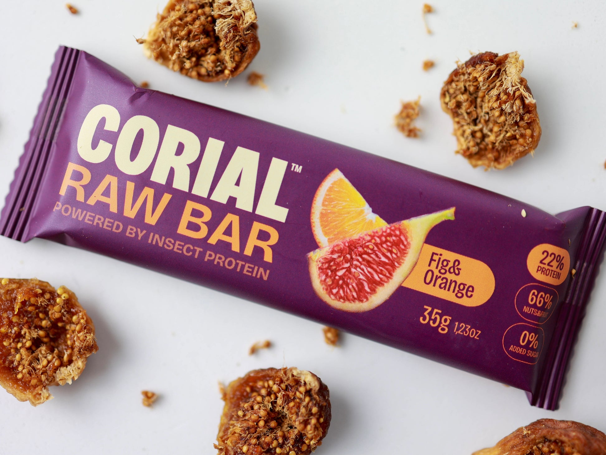 Figo (30%), amêndoa, aveia, larvas de Tenebrio molitor (tenébrio)* (7%) (glúten), colagénio hidrolisado, óleo essencial de laranja (0,2%), sal marinho. Pode conter vestígios de amendoim.
