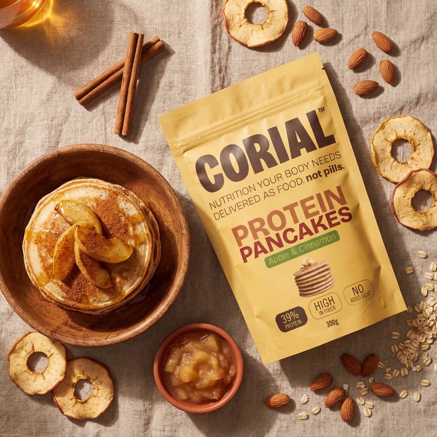 Canela real (0,5%) na massa — não aroma de canela. Feitas com aveia, clara de ovo, proteína de trigo e tâmaras. Sem whey, sem sucralose, sem goma xantana. O tipo de pequeno-almoço que aquece por dentro e nutre a sério.