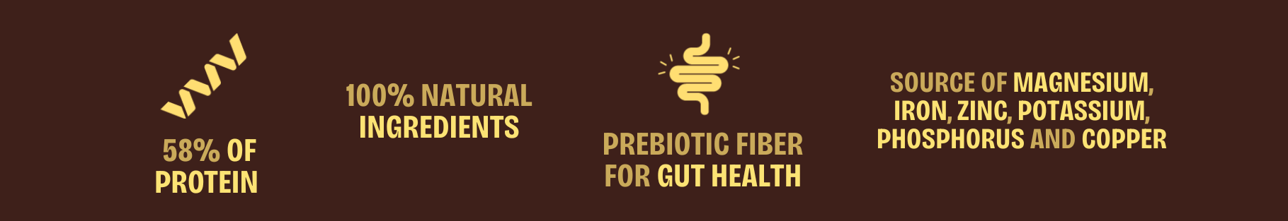 Além da proteína, contém alto teor de fibra, os 9 aminoácidos essenciais e minerais como magnésio, ferro, zinco, potássio, fósforo e cobre.